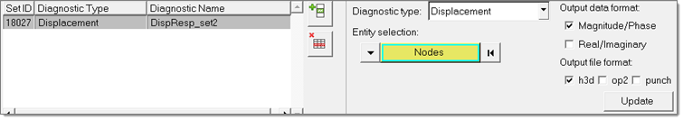 ここで指定される値は、関連する応答自由度のピーク周波数においてのみ出力されます。Synthesis diagnostic type は、Globalまたは任意のSubcaseに対して選択できます。