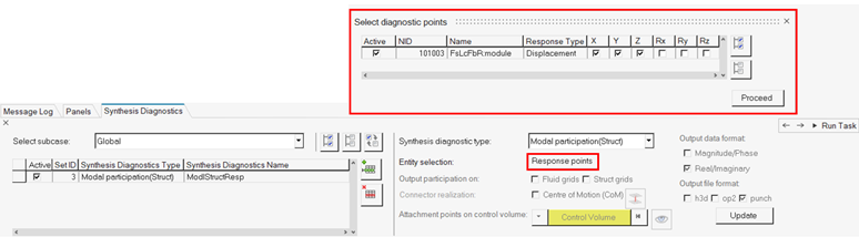 Select Diagnostic Output Request, Synthesis Diagnosticsタスクでは、モーダル寄与率などの応答への分解(寄与率)を呈するSynthesis diagnostic typeを選択します。