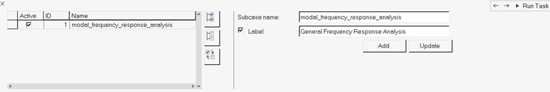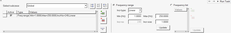 - User Specified Frequency Listを選択して、各サブケースの周波数のリストを入力します。この周波数リストは、別の診断出力サブケース内のOFREQカードによって参照されます。