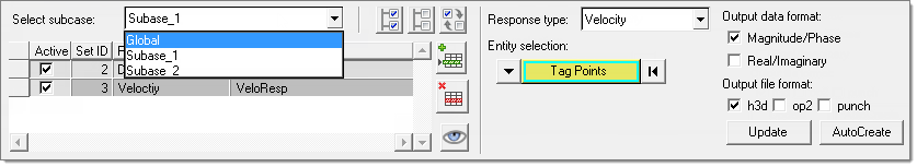 この場合の出力は、選択された応答自由度におけるピーク周波数のスーパーセットが作成されます。実行する分析タイプの選択はグローバルまたはサブケース固有に行うことができます。