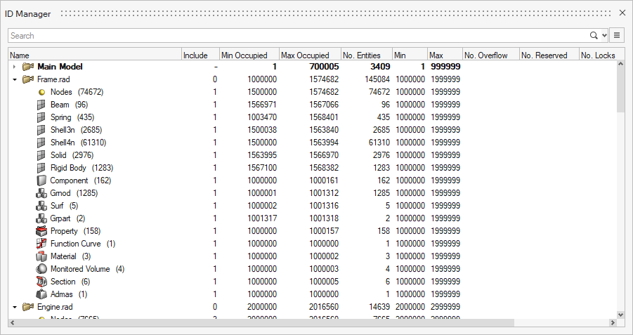 CAEモデル内の有限要素エンティティは、IDおよび名前が与えられ識別されます。IDは、解析計算中にソルバーによって使用され、更に結果においても引き継がれます。このプロセスは、結果を解釈し、有限要素モデルに関連付けることを可能にします。多くの場合、有限要素モデル内の有限要素エンティティのIDは、効率的に識別するために固有でなければなりません。大規模なモデルでは、IDを使った識別を容易にするために、モデルのIDをグローバルレベルで一貫して管理するツールが不可欠です。