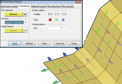 デフォルトでは、材料座標系は要素エッジのC1方向に揃えられます。C1は、要素の節点1から節点2に向かう方向です。材料座標系の表示に重ねて要素座標系を表示することができます。