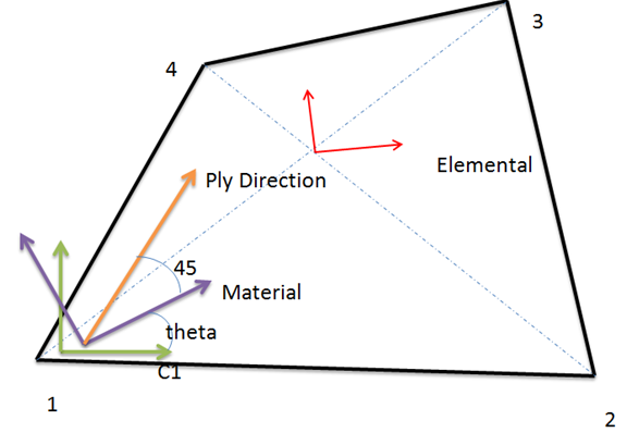 CADベースのプライ角度と向きは解析ソルバーの要素材料系を参照して変換されます。多くの場合、CADからのプライ法線に一致するように要素法線を修正することができます。下の図に示すよう、プライ法線に要素法線を揃えることができないことがあります。このような場合、要素法線を変更せずに要素法線を参照してプライ角度を変更する必要があります。たとえば、要素法線とプライ法線が逆向きの場合+45度のプライはー45度のプライになります。
