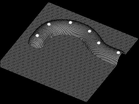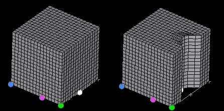 ツール形状には、ball、cone、cylinder、node list、line、plane、surface、およびmeshが含まれます。異なるタイプの成形を簡単に行うには、異なるツールを活用します。例えば、丸みを帯びた底面と終端を持つ湾曲した溝を作るにはnode listまたはline listに加えてballを使用しますが、V-型の溝を作るにはconeを使用します。ballを使うと半球状の窪みや隆起を、coneを使うと円すい状の穴や尖った突起を作ることができます。下の図は、節点リストと"ball"ツールを使って隆起を作成する様子を示しています: