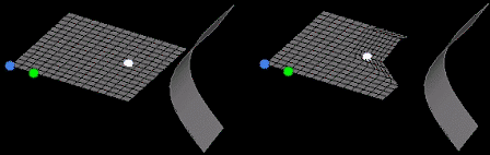 図 9では、メッシュのスカルプティングにsurfaceツールが使用されています。1つの節点がパスに使用されています(メッシュの圧縮によりモーフィングされる)。ツールの両側のテーパー角(45度)の影響、およびツールのエッジで大きなメッシュの歪みの発生を防止している様子がわかります。