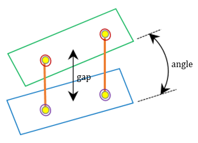 スポット溶接位置で平行でないフランジが特定されます。2つのシートメタルパート間の角度がこの角度値を上回っており、ギャップ値も上回っている場合に、それらが特定されます。図 11.