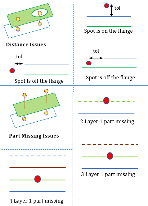 スポット溶接と最も近いフィーチャーエッジ間の距離がトレランス値を上回っている場合に、問題と特定されます。トレランスは、スポットガンの“半径+ギャップ”を表します。図 13.
