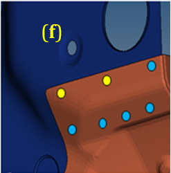上記パラメータを使用した仮想スポット(VS)溶接の作成。各仮想コネクター(VC)に対して、“search tolerance”値を使用して最も近い既存のスポット溶接(青色)を検索し、青色のスポット溶接が見つからなかった場合、位置(黄色)を特定します。図 15.