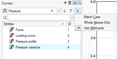 矢印キーまたはアイコンを使用して、条件に一致するカーブをナビゲートできます。ドロップダウンメニューを使用して、大文字と小文字の一致、名前全体、ワイルドカードの条件をさらに微調整することができます。図 4.