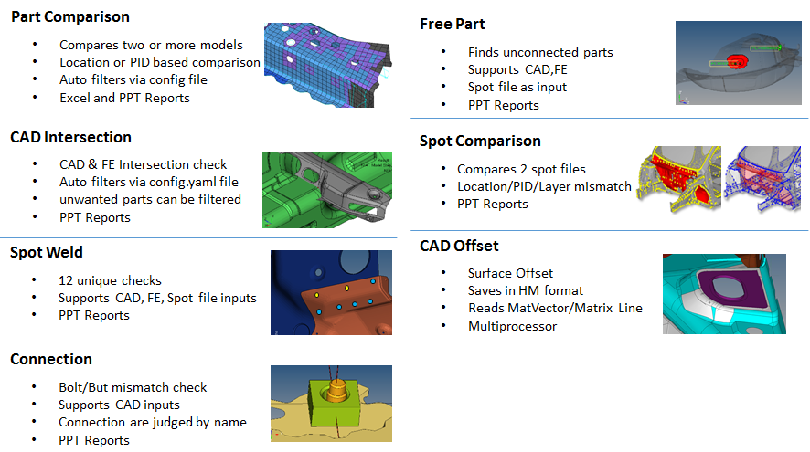 VerificationツールとComparisonツールは、CADモデルに対して交差、スポット溶接、結合、およびパート比較のチェックを実行し、組み込みのHyperView Playerを使用して、MS-ExcelスプレッドシートとPowerPointスライドに、問題がハイライト表示された明確なレポートをエクスポートします。