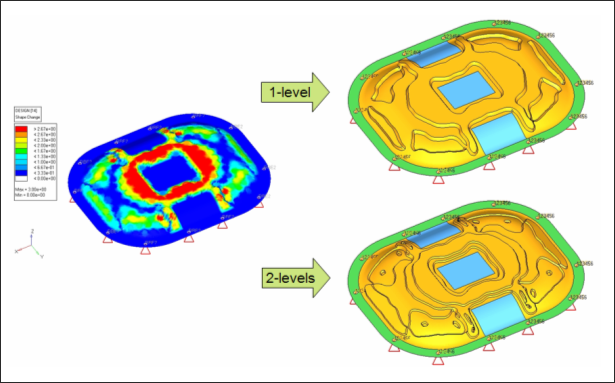 OSSmoothの自動ビード機能では、OptiStructトポグラフィー最適化を1層または2層のビードとしてリカバリーします。
