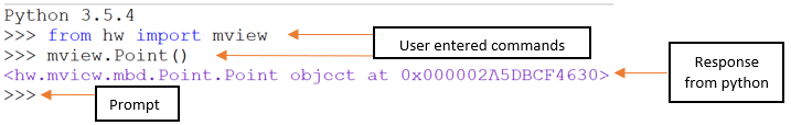 >>> from hw import mview# import mview package >>> p1 = mview.Point(name="p_0", x=1, y=4, z=3)# creates a point >>> b1 = mview.Body(name="Body1")# creates a body >>> m1 = mview.Marker(name="Marker1",body=b1,origin=p1)# creates a marker at origin p1 and on body b1 - Accessing Attribute Values