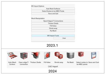 - インタラクティブモードでHyperMeshを使用してCAD/FEをインポートする際に表示されるHyperMeshのユーティリティメニューが、MVUtilsリボンに移行されました。