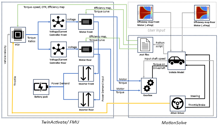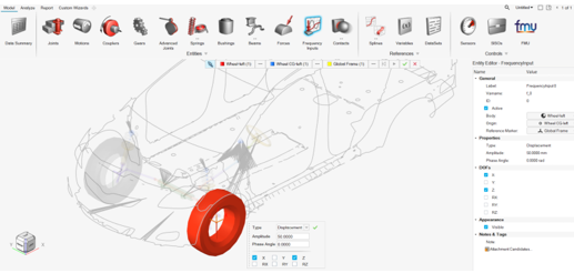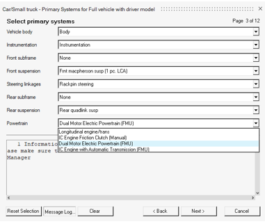 - MotionViewは、自動車/小型トラック車両ライブラリにデュアルモーター搭載の電動パワートレイン(FMU)モデルを含めるオプションを追加しました。このオプションは、" Full vehicle with Driver "および " Four wheel drive"のドライブライン構成で利用可能で、AssemblyウィザードのPowertrainメニューからアクセスできます。