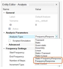 - アナリシスのエンティティエディターは、以下の解析タイプをサポートしています:周波数応答解析、静解析+周波数応答解析。