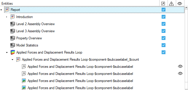 注: この実行プロセスには数分かかる場合があります。ヒント: Previewオプションを使って、画像と結果のテーブルを確認できます。必要な画像と結果のテーブルは、図 5のとおり、レポートツリーのApplied Forces and Displacement Results Loopの下に追加されます。