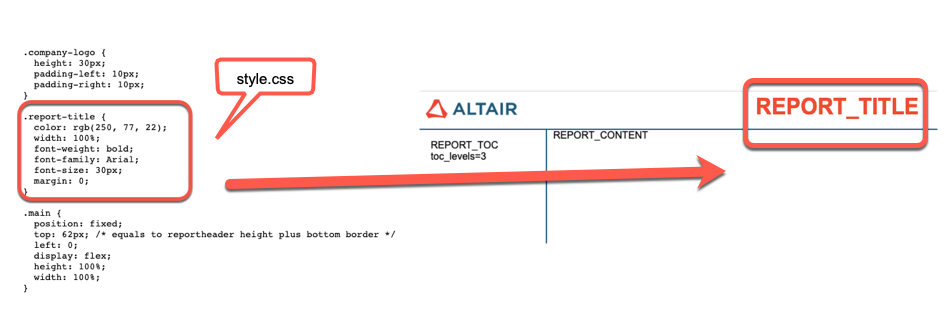 各プレースホルダーのプロパティを変更するために、リソースフォルダー内のstyle.cssを編集します。たとえば、REPORT_TITLEを変更するには、style.cssファイル内の