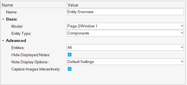 任意のレポートのModel Descriptionセクションへのコンポーネント、プロパティ、材料といった各種エンティティの概要を示す画像をキャプチャーし、追加します。