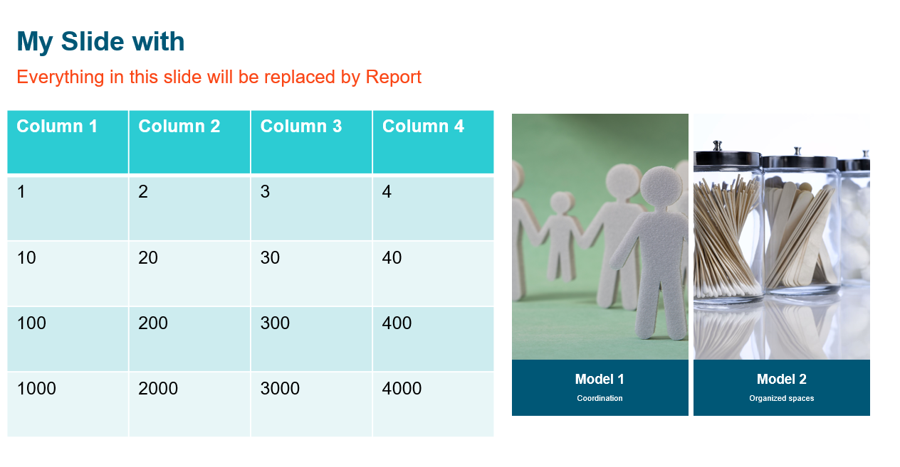 - Slides with Existing Content - 既存のコンテンツを持つスライドをベースとしたPresentation Layoutテンプレートには、サンプル画像、テキスト、およびテーブルデータが存在する必要があります。このサンプルデータは後ほど、レポートのエクスポート時に置き換えられます。このスライドをレポート内で使用すると、レポートをエクスポートする際に、同じ画像、テキスト、テーブルが実際のレポート内容に置き換えられます。以下のサンプルでは、5つのテキストボックス、2つの画像、1つの表がレポート構造に読み込まれ、エクスポート時に新しいレポートコンテンツに置き換えられます。