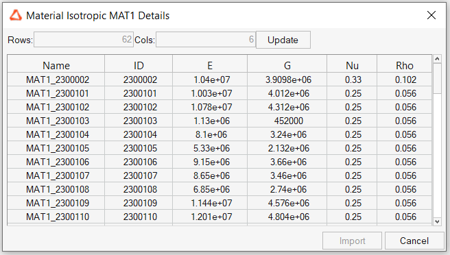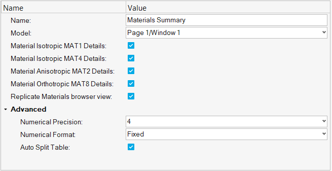 - このオプションは、HyperMeshの材料ブラウザに現在表示されている表形式の詳細を再現するものです。