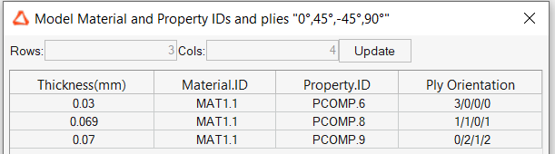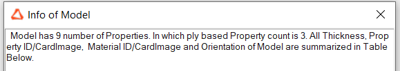 Ply Orientation Summaryモジュールは、プライの板厚に基づきモデル全体のプライベースのプロパティの概要を作成します。板厚、材料ID、プロパティID、プライの方向などの分布概要を作成します。
