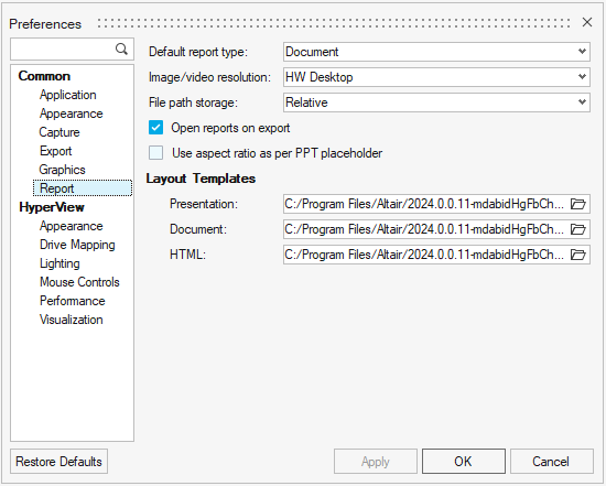 デフォルトのレポートタイプをドキュメントまたはプレゼンテーションに変更し、レイアウトドキュメントのプリファレンスを更新できます。図 1.
