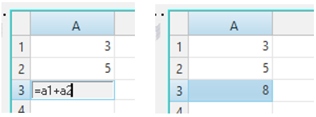 2つのセルA1とA2の値を加算してセルA3に記述するには、次のように入力します。
