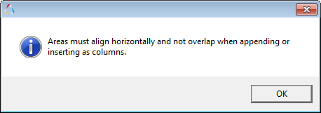 注: オーバーレイを実行しても、元のテーブルにある既存のセルは変更されず、何の影響も受けません。テーブル内の複数のエリアがオーバーレイ用に選択された際、それらのエリアは、列によるオーバーレイの場合は横に、行によるオーバーレイの場合は縦に揃える必要があります。いずれの場合も、選択されたエリアは重なってはいけません。テーブル内の複数のエリアがオーバーレイ用に選択され、2つ目のエリアが重なっていて1つ目のエリアと正しく揃えられていない場合、2つ目のエリアが選択されると直ちに以下のようなメッセージが表示され、その選択は許可されません。