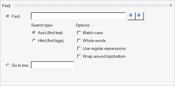 検索するテキストを入力します。検索タイプがHTMLの場合は、‘<’文字と‘>’文字を省略します。たとえば、すべてのテーブルデータタグ(‘TD’)を検索するには、Find欄に‘TD’のみを入力する必要があります。