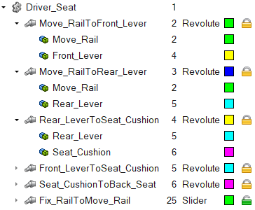 MechanismブラウザでDriver_Seatメカニズムを展開し、定義されたさまざまなジョイントやボディを確認します。