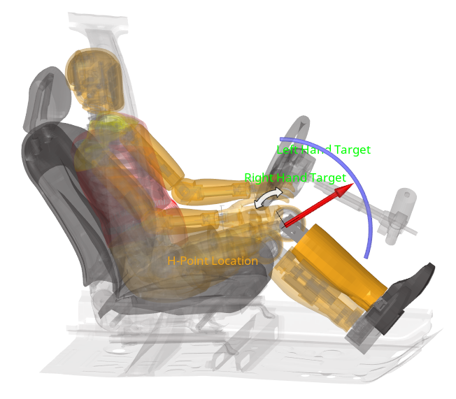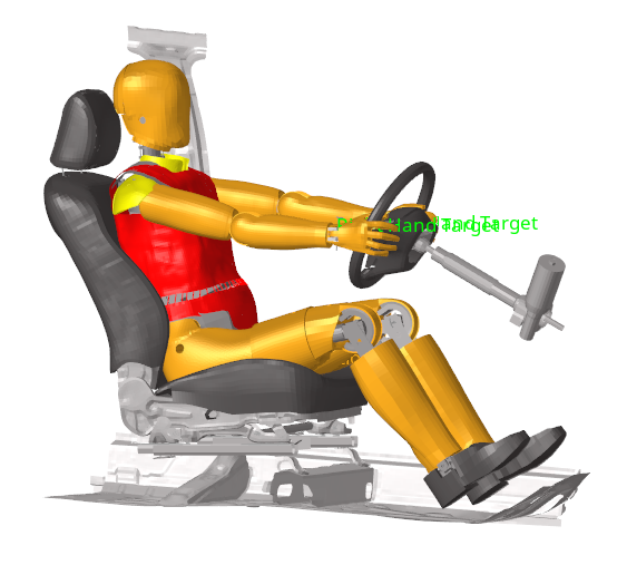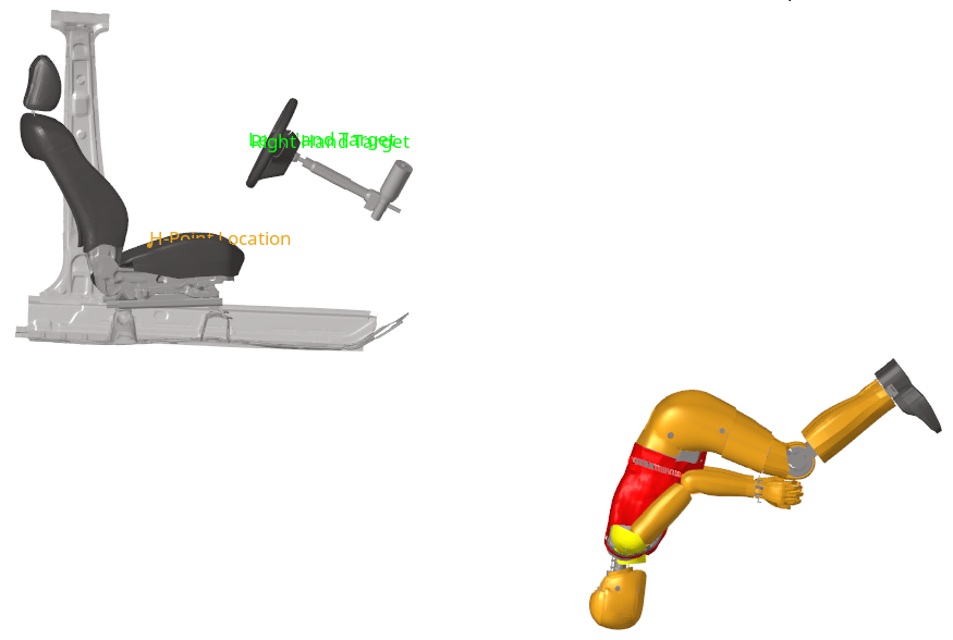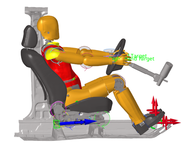 この時点で、シートが動くとそれに応じてグローバルなダミーの動きが生じます。また、足などのようにその位置に留まる可能性のあるダミーのボディの一部を拘束することもできます。