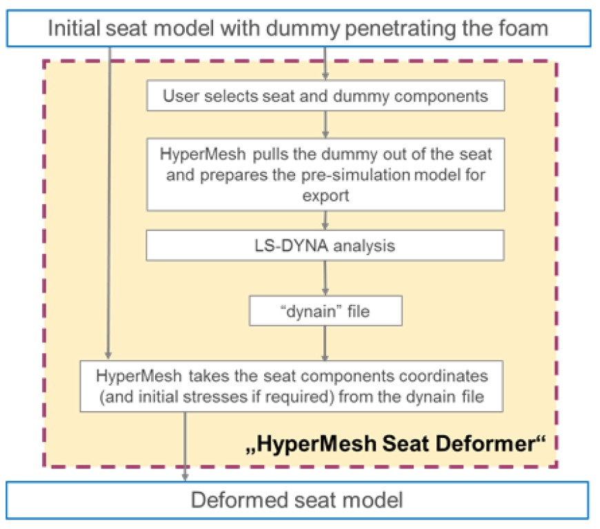ダミー下のシートの変形をシミュレートするため、Seat Deformerツールにより、適切なソルバーに対する入力デックをエクスポートできます。その後、シミュレーション結果ファイルをインポートすることで、初期FEモデルを更新し、ダミーとシートの間の交差と貫通を除去します。図 7.