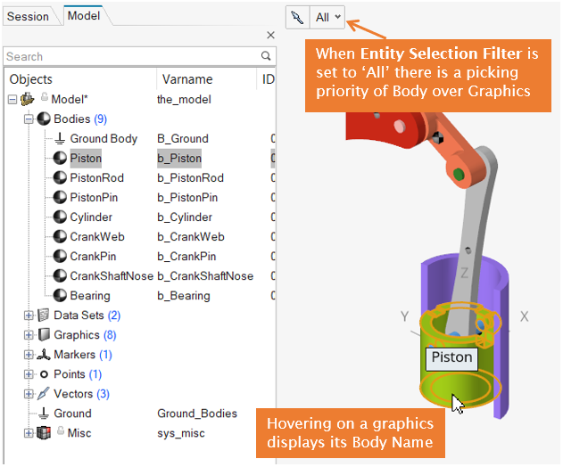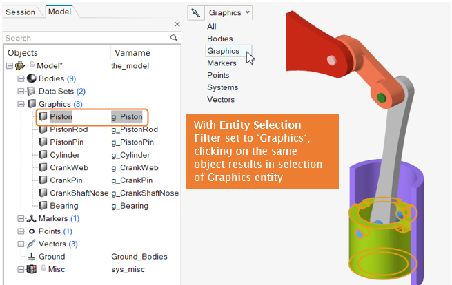 Entity Selection filter(モデリングウィンドウの左上)をAllからGraphicsに変更し、画面上の同じPistonオブジェクトをもう一度クリックします。