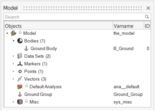 注: モデルブラウザの各エンティティフォルダーは、展開したり折りたたんだりしてそのコンテンツを確認でき、同じフォルダーに含まれているエンティティの数がかっこ内に表示されます。例えば、BodiesフォルダーにはデフォルトでGround Bodyがあります。Ground Bodyは、シミュレーション時に移動しません。 -