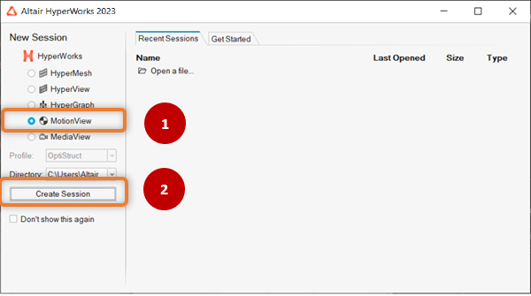 新しいセッションが開始され、ページ / ウィンドウにMotionViewがアクティブクライアントとして表示されます。注: 1つのセッションは、1つまたは複数のページで構成できます。各ページは複数のウィンドウレイアウトを持つことができ、各ウィンドウはそれぞれ別のクライアントを有し、さまざまなモデリングニーズや結果確認ニーズに対応しています。以下のクライアントを使用できます: