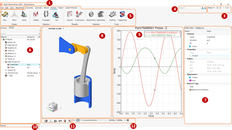 - Status Barには、現在読み込まれているモデルに関する情報が示され、MotionViewのステータスが随時表示されます(ReadyやImporting Geometryなど)。