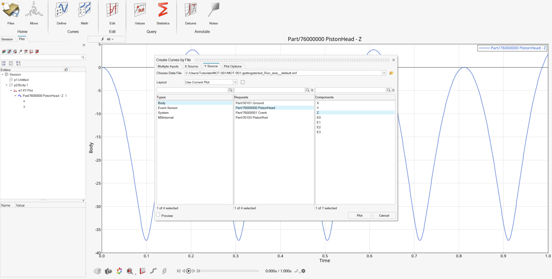 HyperGraphクライアントを含む新しいページがセッションに追加され、Create Curves by Fileダイアログが表示されます。MotionSolve結果ファイル(*.mrf)があらかじめ選択されています。 -