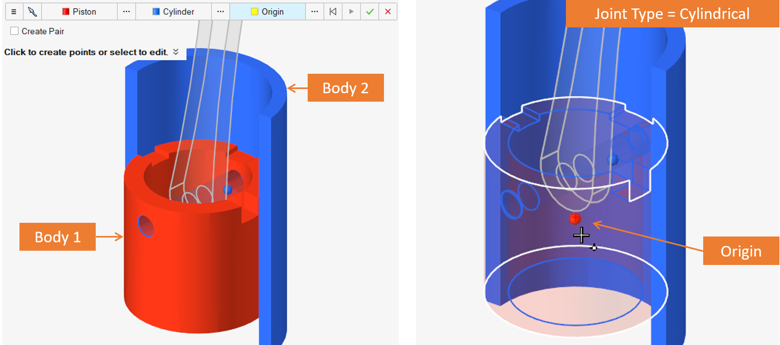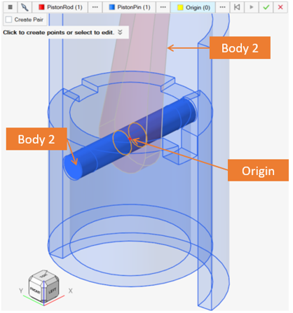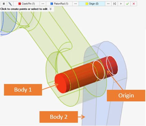 PistonRodをBody 1として、PistonPinをBody 2として、PistonRod穴のサーフェス中心をジョイントのOriginとして使用して、もう1つの回転ジョイントを作成します。