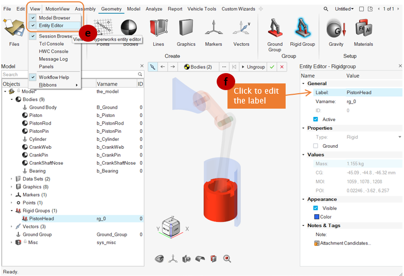 - PistonCylinderAssembly.x_tを作業ディレクトリからMotionViewクライアントのモデリングウィンドウにドラッグ&ドロップします。