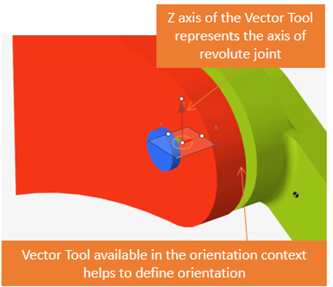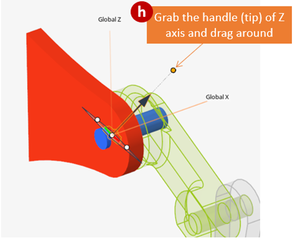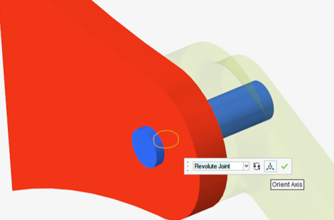 CrankPinをBody 1として、PistonRodをBody 2として、Crank Bossの内側サーフェス中心をジョイントのOriginとして使用して、回転ジョイントを作成します。ジョイントの方向としてGlobal Xを選択します。