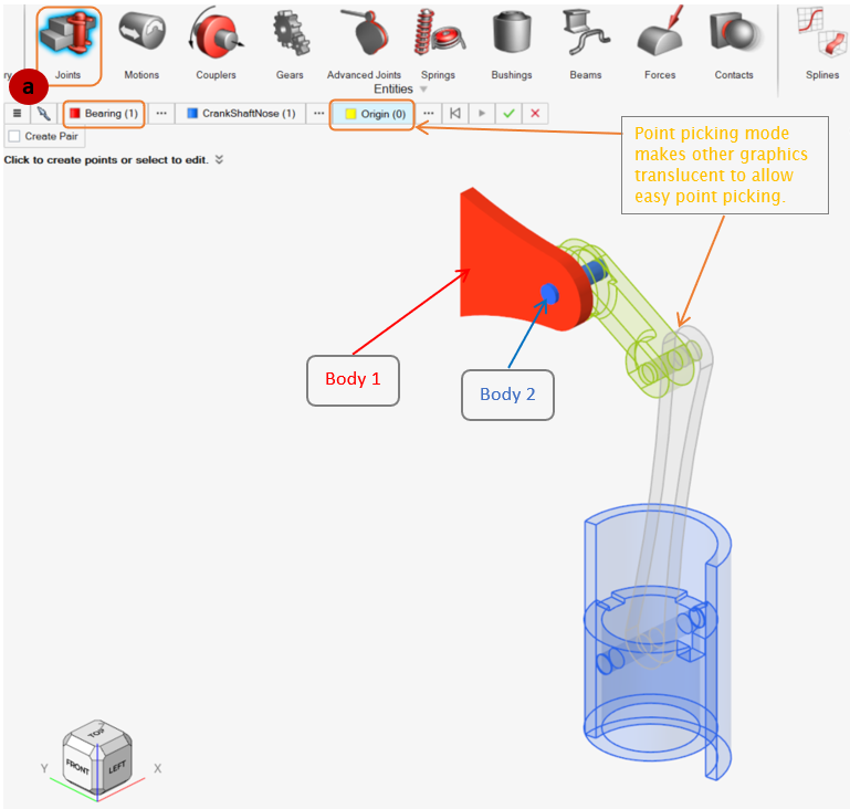 モデリングウィンドウで、Piston(下図の緑色のコンポーネント)にカーソルを合わせます。このオブジェクトがハイライト表示され、このオブジェクトのラベルが吹き出しテキストで表示されます。このオブジェクトをクリックすると、このボディが選択されます。
