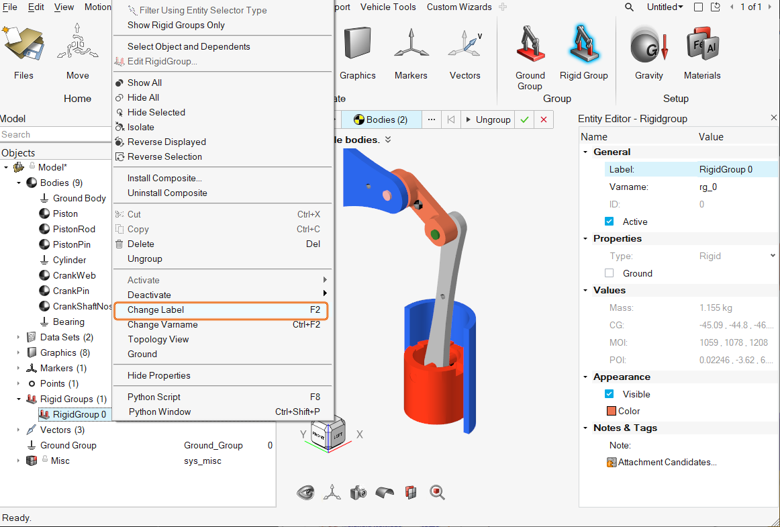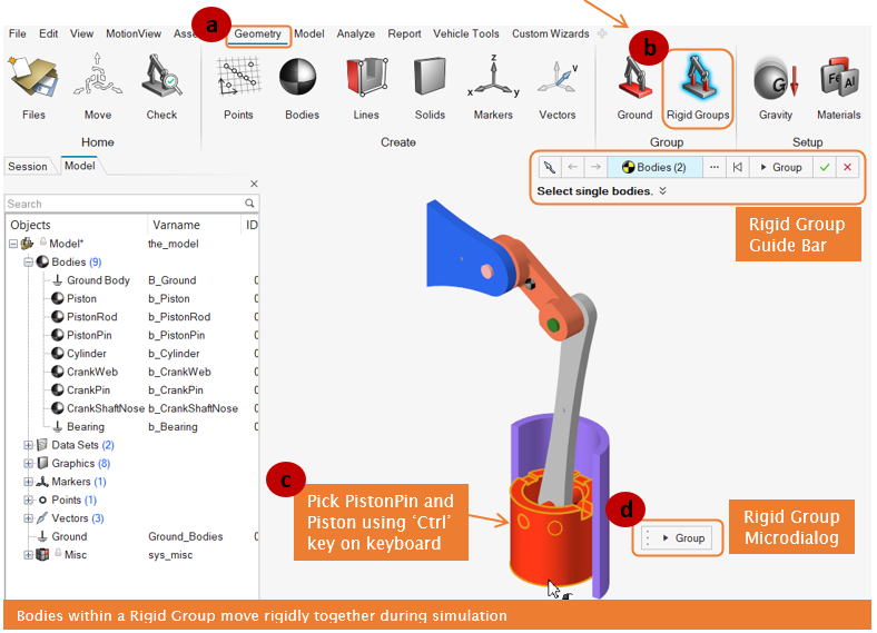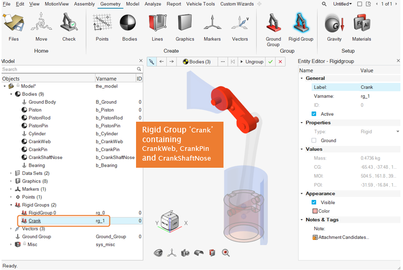 3つのボディCrankWeb、CrankPin、CrankShaftNoseを含む別のRigidGroupをセットアップします。RigidGroupの名前を‘Crank’に変更します(Rename)。