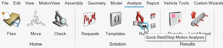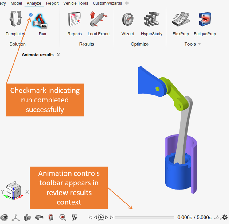 注: MotionViewはモデルチェックを実行してから、MotionSolveにランを投入します。モデルの動きは、解析の進行中にMotionViewウィンドウで確認できます。モデル内に力は定義されていませんが、パートはデフォルトの重力を受けて落下する際に動きます。Run Statusダイアログが開き、進行中の現在のランのステータスが表示されます。注: ランが完了すると、リボンのRunアイコン付近に青いチェックマークが表示され、ランが正常に完了して、モデルで結果が得られていることが示されます。ラン後に、モードは自動的にResults Reviewコンテキストに設定され、Runアイコンが青色でハイライト表示されます。図 27. ラン結果レビューのコンテキスト