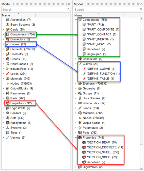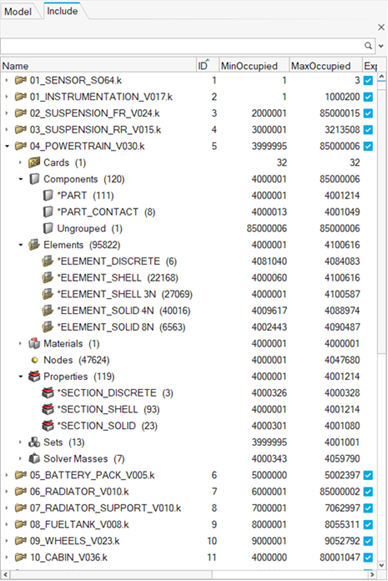 モデルブラウザのインクルードビューには、インクルードファイルに基づいたモデルの内容が、節点数と要素数とともに表示されます。インクルードビューには、インクルードファイルレベル、エンティティレベル、およびサブエンティティレベルでの使用されている最小および最大IDも表示されます。使用されているIDの最小値と最大値の列は、モデル内容表示ビューでもオプションでオンにすることができます。