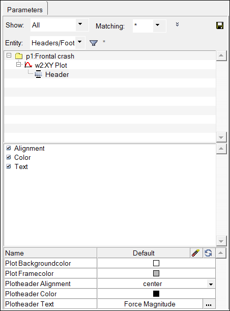 下の図では、ヘッダー、レジェンド、カーブ属性といったその他の属性が表示されています。ウィンドウパラメータと同様に、ブラウザの上の領域から属性を選択すると、自動スクリプトパラメータとなり、そのデフォルト名と属性値が、ブラウザ下部のパラメータ一覧内に表示されます。パラメータのラベルを変更するには、Name列の下の名称をクリックし、新しいラベルを入力します。同様に、パラメータのデフォルト値を変更するには、Default列のセルを選択して新しいデフォルトを入力します。スクリプトが読み込まれると、ラベルがデフォルト値と共に表示されます。図 3. Headers/Footers属性が選択されているParametersブラウザ