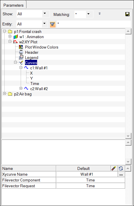 名称、ラベルおよび数式では、接頭部、接尾部、検索と置換、文字代入の範囲、テキストブロック全体の置換といった様々なパラメータスタイルがサポートされています。図 4. カーブ名、コンポーネントおよびリクエスト属性が選択されているParametersブラウザ