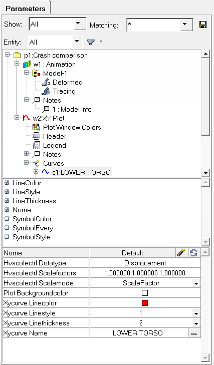 Parametersブラウザは、各エンティティに割り当てられている属性も含め、現在のセッション内のすべてのウィンドウとページを表示します。各エンティティの下には、そのエンティティのリストが表示されます。属性の横のチェックボックスをアクティブにすると、その属性をパラメータとしてパラメータ一覧(ブラウザの下半分)に含めます。これは、プロセスが再実行される際にデフォルトとして定義または保持されます。ブラウザを表示するには、HyperMesh以外のクライアントでをクリックします。図 1. Parametersブラウザ