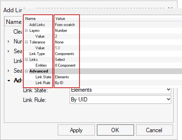Number of Links コネクターの板厚(層)の数を選択します。 Value列をクリックして、プルダウンメニューから次のLayersオプションのいずれかを選択します:- Keep old