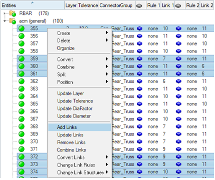 リンク(コンポーネント、アセンブリ、サーフェス、要素、タグ、節点)を、一度に1つまたは複数のコネクターに追加できます。