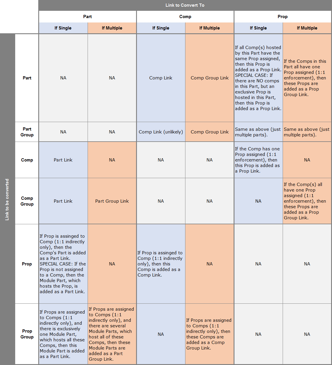 既存のコネクターリンクは、以下のリンクタイプに変換することができます:Part、Comp、またはProp。コネクターリンク変換は、コンポーネントとプロパティの1対1の関係を必要とし、それ以外の場合変換は固有でなく処理されることはありません。